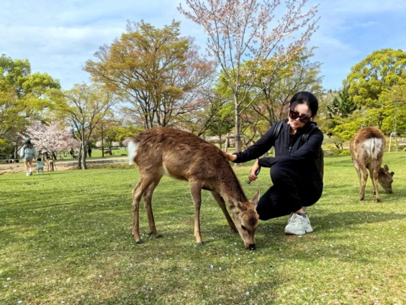 奈良除了古色古香的建筑之外,最让人印象深刻的就是悠闲行走于林间以及道路旁或三两结伴或成群结队的小鹿。在奈良,不管是寺庙还是公园,或是路边山角,随处都可见她们的身影,或是从两树间转出身来,或是从石碑间探出头来,当你看向她们时,她们也凝望着你,目若秋水含情脉脉,不由得让人心生爱怜。鹿本身就是极有灵性的动物,我们中国人自古就很喜欢鹿,也不乏有许多描写鹿的诗句,其中《诗经》里有诗云:“呦呦鹿鸣,食野之苹。”然而自工业革命以来,人类挤压了鹿的生存空间,数量大为减少。但奈良的小鹿是幸运的生灵,生活在这里的人们对待她们极具宠溺,而她们以同样的温情回报人类。不知是否为入乡随俗,奈良的鹿也学会了当地人的恭让与谦逊,当凑近喂她们食物时,她们竟然也会低头鞠躬,既觉得可爱也让人忍俊不禁。