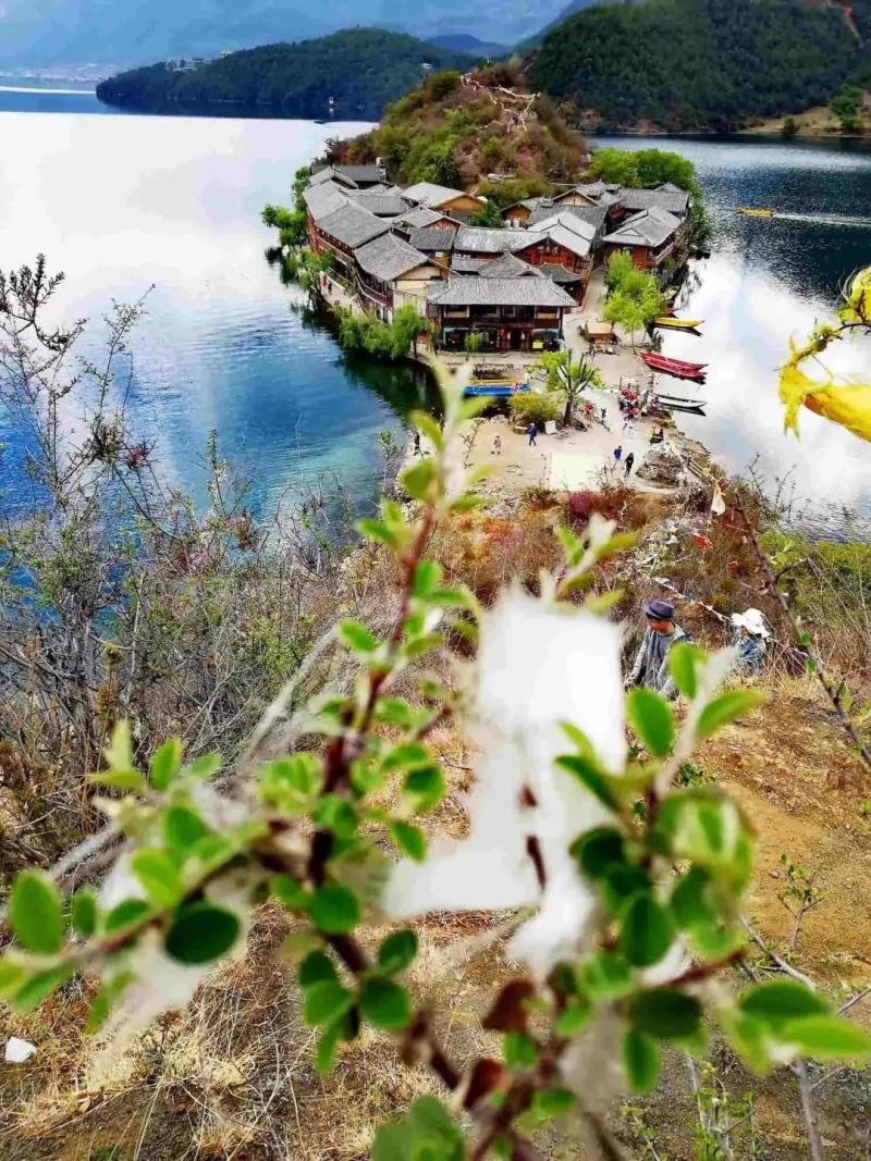 肖淑明婚嫁摩梭土司之后,她给摩梭人带去汉人课本50册,教她们断文识字,熟读《诗经》《山海经》等等。土司家族在泸沽湖岛中岛大兴土木建起一处居所,而摩梭王妃肖淑明在这座岛上度过她的后半生。这么传奇的地方,我何尝不想一睹她的芳容呢?这日正午,我叫船工渡船至贵妃岛。贵妃岛虽然面积略小但却极为精致,岛上特色建筑遍布,有大殿与前厅后院,还有贵妃岛博物馆以及游客下榻民宿等等。飞阁流丹的建筑处处别具匠心,大大小小的亭台楼阁均是雕梁画栋。颇有皇家园林气派。贵妃岛建筑群古朴典雅,气势恢宏,置身其中的游客皆会产生一种无比超俗感觉来!贵妃岛呈现自己眼前的一切,可谓美轮美奂,让游客目不暇接呀!