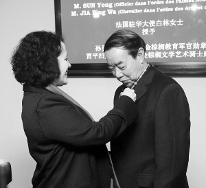 2013年,法国驻华大使白林女士代表法国文化部为贾平凹佩戴法兰西金棕榈文学艺术骑士勋章