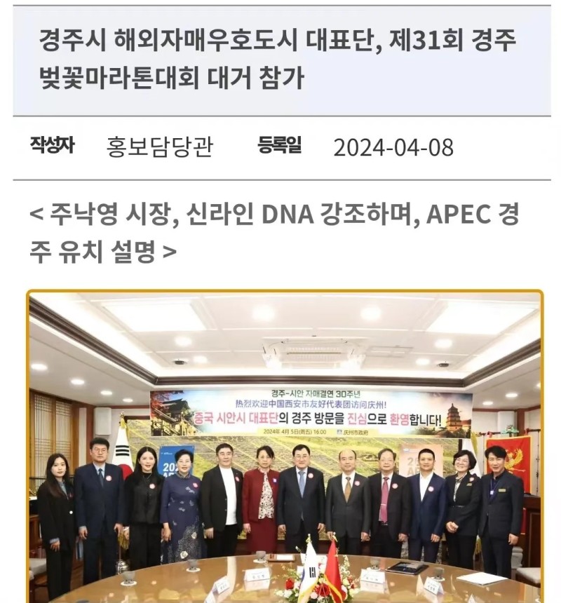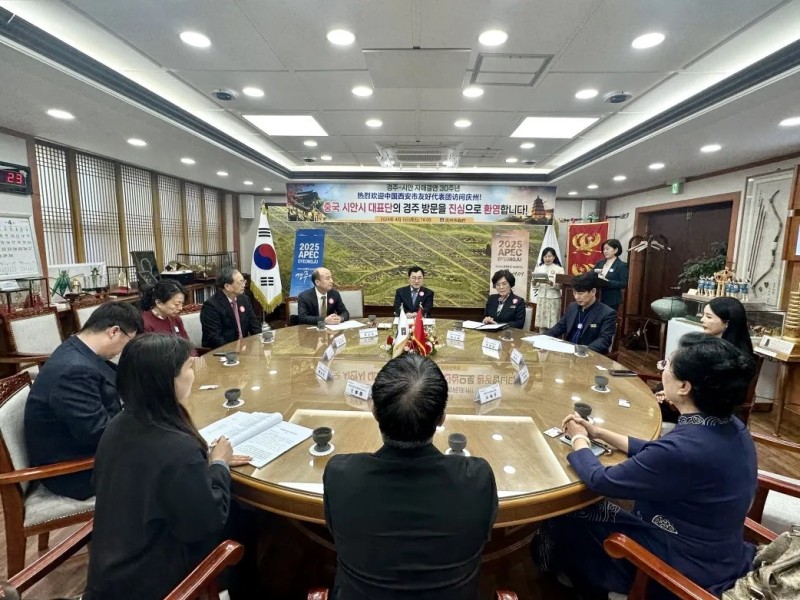 今年是西安市与庆州市结为友好城市30周年。庆州市市长朱洛荣与代表团进行了座谈交流,共同参观了庆州市政府举办的西安书画摄影展。