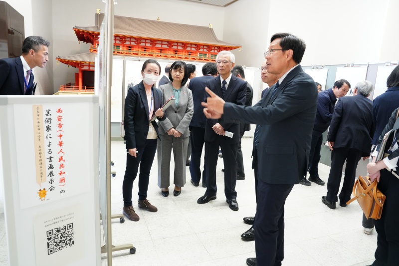 在京都市政府,西安代表团与京都市市长松井孝治、京都市议会议长西村义直进行了座谈,共同参观了书画摄影展和座落在京都市政府广场的两市友好见证—“汉白玉大雁塔模型”。