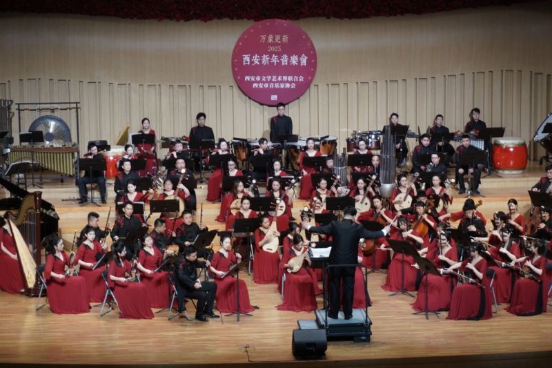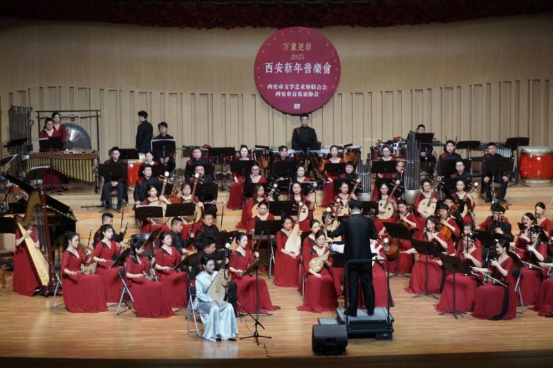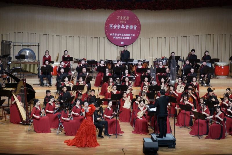 国乐高奏,金鼓齐鸣,由西安市文学艺术界联合会、西安市音乐家协会共同主办的万象更新-2025西安新年音乐会,1月3日在西安精彩上演。夜幕下的一带一路艺术中心华灯璀璨、星光熠熠,剧场内座无虚席、气氛热烈。省市相关领导和我市文艺界代表、千余名广大市民朋友们欢聚一堂,共同聆听长安新春的乐章,共赴国乐和美的音乐之旅。
