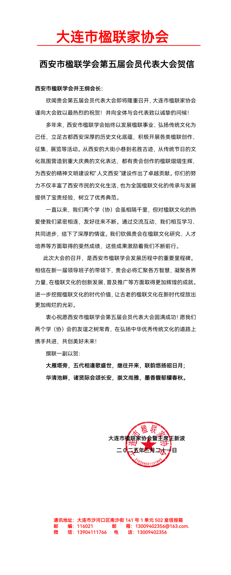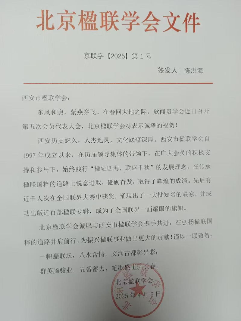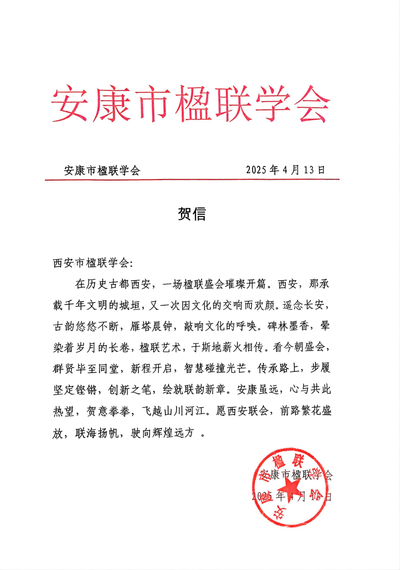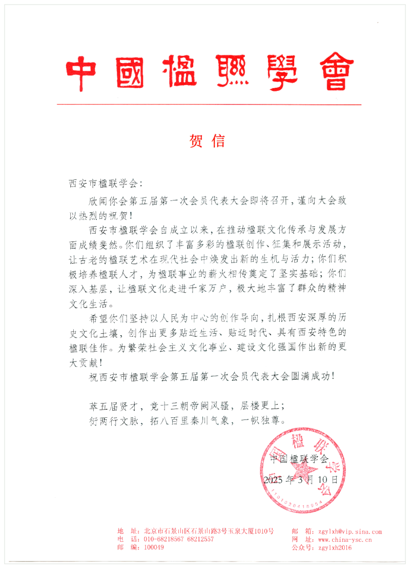 大会收到了来自中国楹联学会、北京市楹联学会、天津市楹联学会、大连市楹联学会、安康市楹联学会等省市学会发来的贺信,他们对本次大会的成功召开表示热烈祝贺。