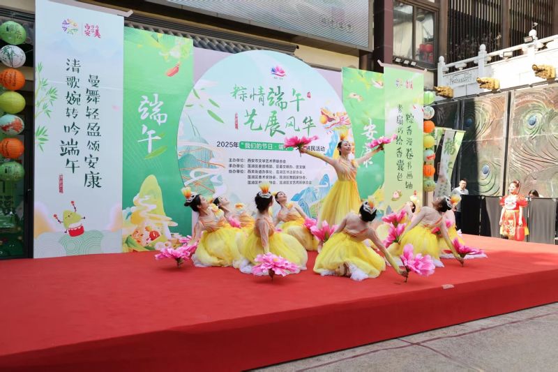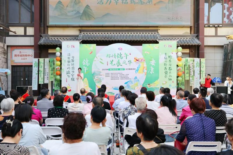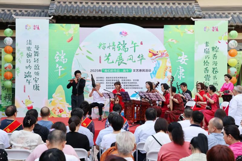 活动在精彩的文艺表演中拉开帷幕。莲韵民族乐团演奏的《牧民新歌》《扬鞭催马送粮忙》用欢快的节奏瞬间点燃了现场气氛;劳动一坊社区 “五老” 宣讲团成员王保印表演的快板书《竹板奏响新时代》节奏明快,展现了新时代的蓬勃风貌;全国道德模范陈若星老师娓娓道来在端午与大家共话家风;区舞蹈家协会带来的舞蹈《绽放》舞姿袅袅、优美灵动;三意社著名演员安金香带来的秦腔《相送公子出院门》《探窑》,唱腔醇厚,尽显秦腔艺术的独特魅力;秦腔爱好者党兰不仅为大家带来了秦腔《杨八姐盗刀》,还向大家发出了共同参加秦腔戏迷大赛的邀约;演出在陈晓萍演唱的《百姓的幸福生活》中圆满落幕,温暖的歌声里饱含着对当下生活的感恩与对观众的美好祝愿,为整场活动画上了温馨动人的句号。