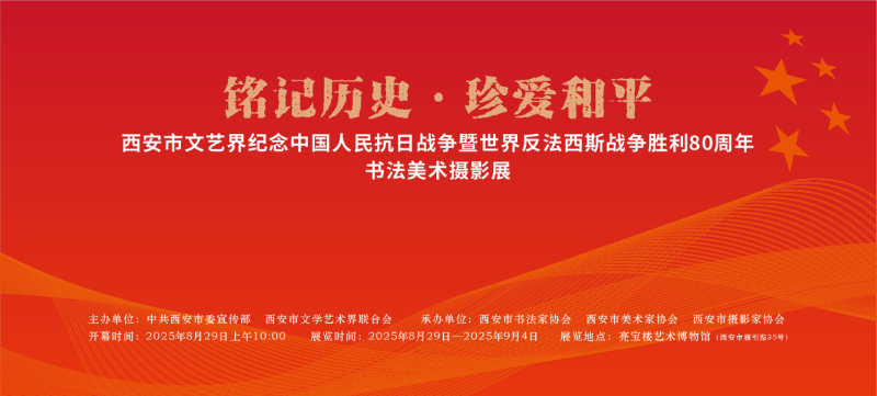 本次展览由中共西安市委宣传部、西安市文学艺术界联合会联合主办,西安市书法家协会、西安市美术家协会、西安市摄影家协会共同承办,以文艺为媒,精心挑选300余件书法、美术、摄影作品,再现烽火岁月中的民族风骨,传递新时代文艺工作者的家国情怀。