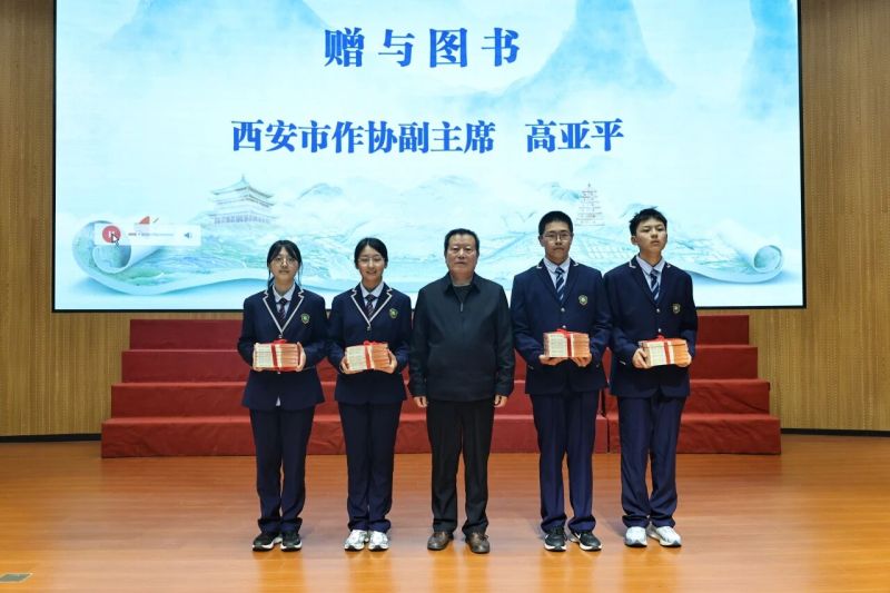 西安市作协向学生赠送《唐诗三百首》书籍。