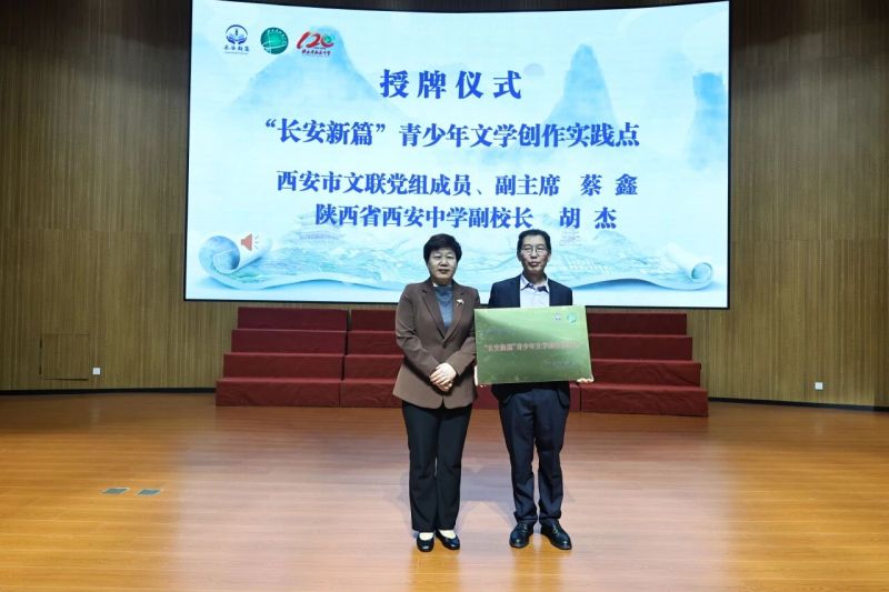 西安市文联党组成员、副主席蔡鑫为西安中学授予“长安新篇”青少年文学创作实践点牌匾。