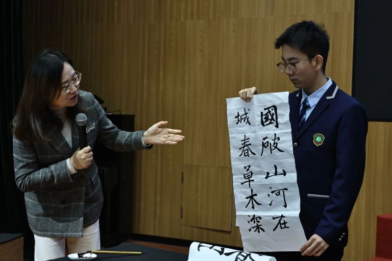 在“写唐诗・品墨韵”环节,学生们现场挥毫泼墨,用软笔、硬笔书写唐诗;李志瑾副教授结合作品详解 “唐代楷书笔法”与“书法与诗意的融合”,有针对性地讲解了唐代楷书笔法与书法诗意的融合。