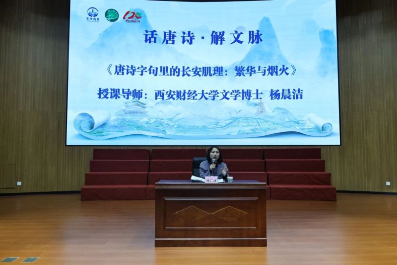 在“话唐诗・解文脉”环节,杨晨洁博士以《唐诗字句里的长安肌理:繁华与烟火》为题,结合“春风得意马蹄疾”的曲江、“年年柳色,灞陵伤别”的灞桥等诗句,串联诗人际遇与城市风貌,对唐诗经典进行了深入解读。