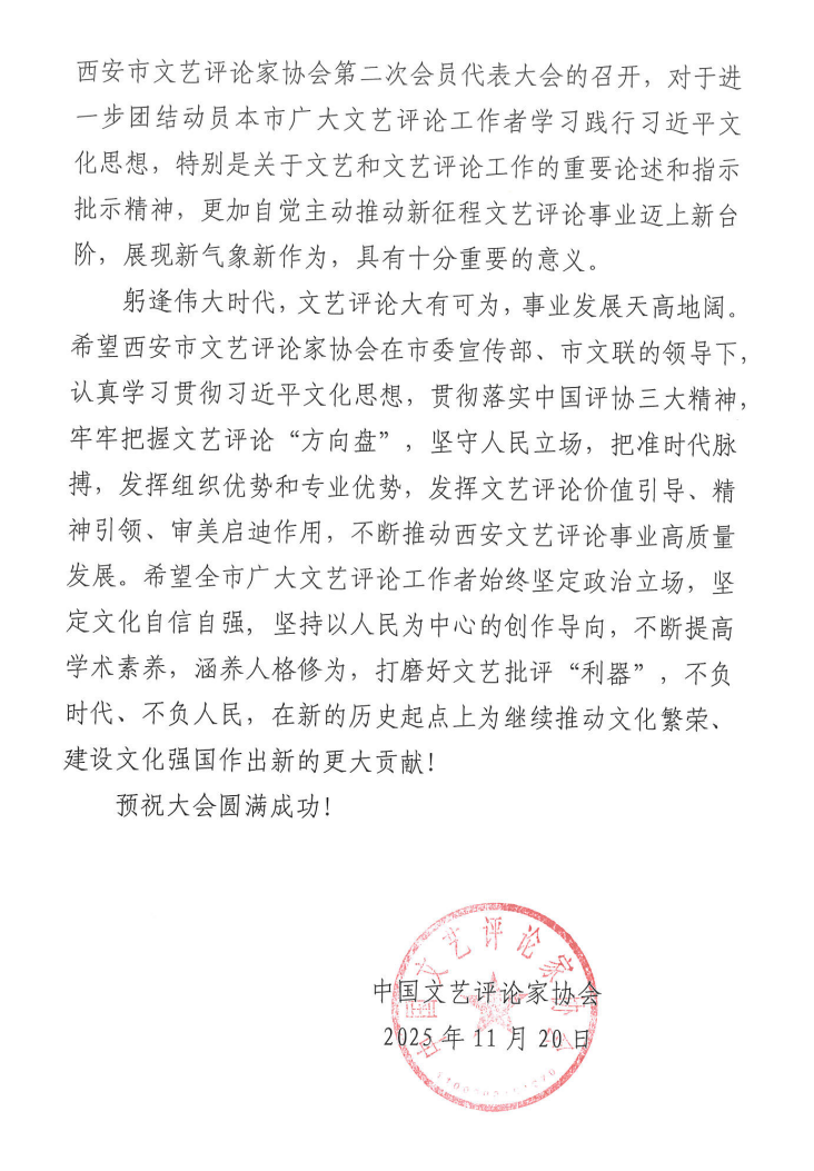 文艺评论是文艺事业的重要组成部分,是引导创作、多出精品、提高审美、引领风尚的重要力量。西安市文艺评论家协会自成立以来,团结带领全市广大文艺评论工作者,立足西安深厚文化底蕴,聚焦文艺创作实践,推出了一批有思想、有温度、有深度的评论成果,为繁荣西安文艺事业作出了积极贡献。未来,将以更加饱满的热情投入到文艺评论工作中,积极发挥评论的引导作用,助力西安文艺事业在新时代绽放新光彩。