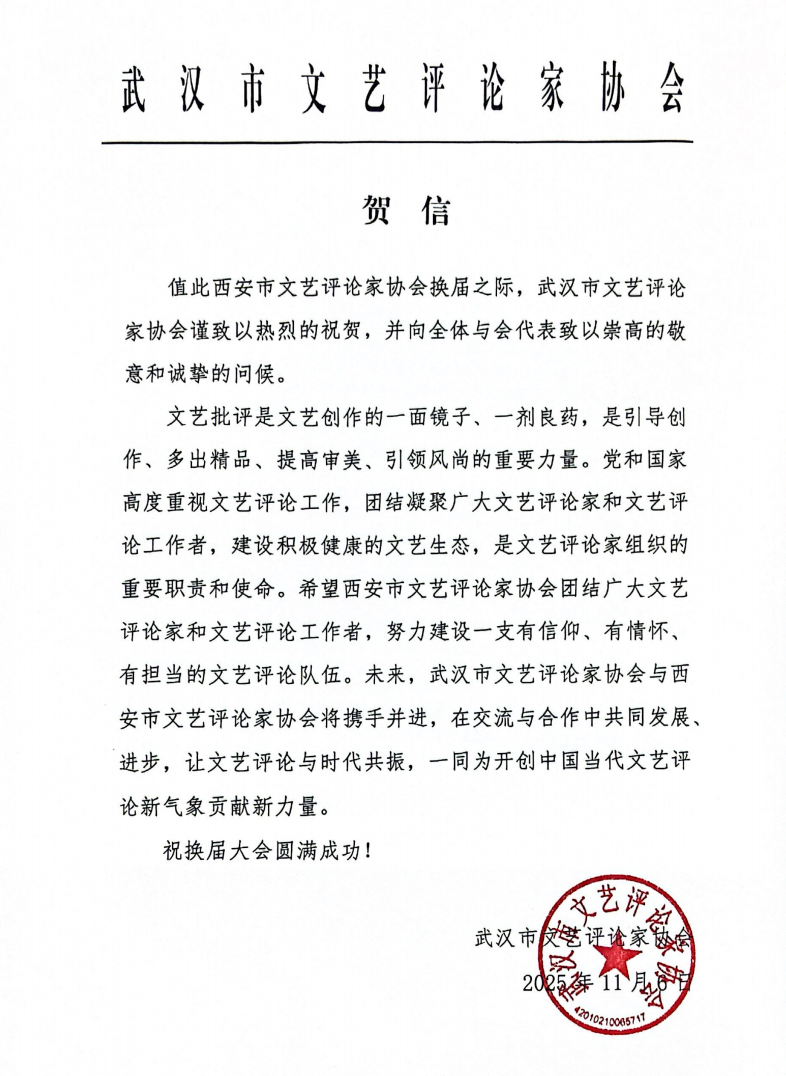 大会收到了中国文艺评论家协会、四川省文艺评论家协会、武汉市文艺评论家协会的贺信。
