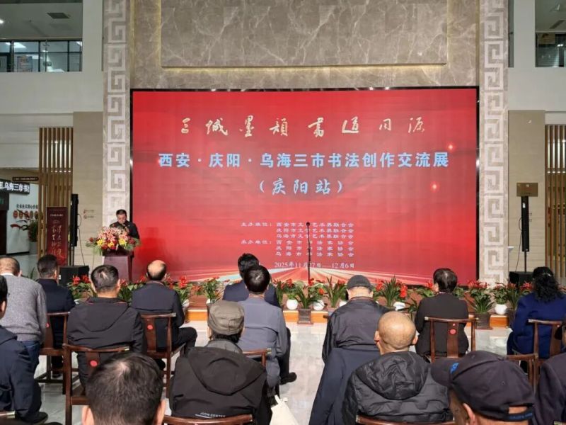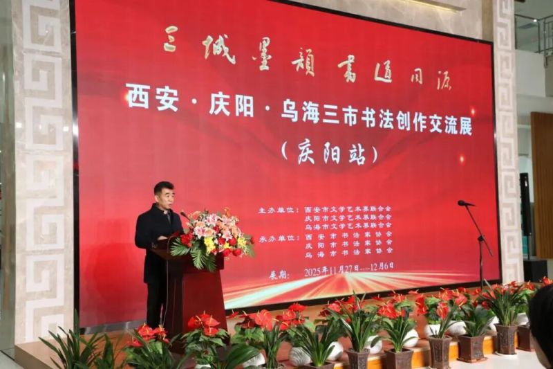 11月27日下午,由西安市文学艺术界联合会、庆阳市文学艺术界联合会、乌海市文学艺术界联合会主办,西安市书法家协会、庆阳市书法家协会、乌海市书法家协会承办的“三城墨韵 书道同源”——西安·庆阳·乌海三市书法联展在庆阳市美术馆开展。