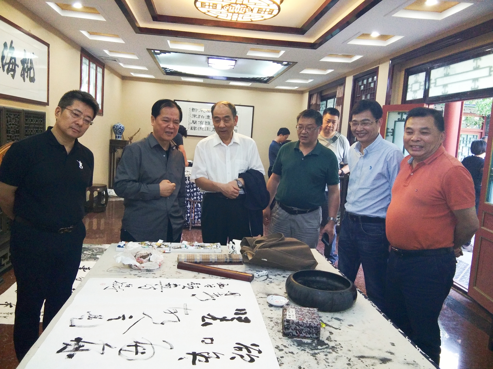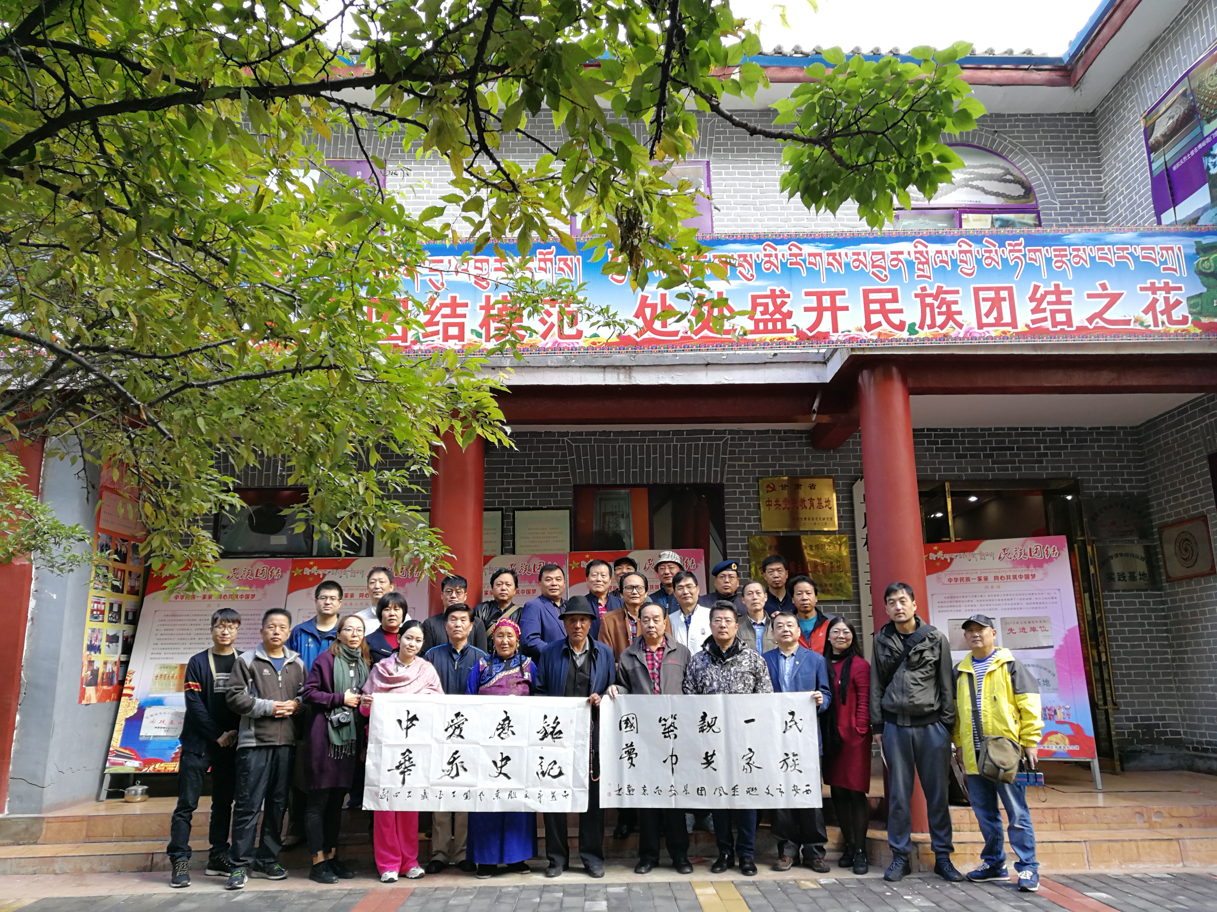 参观完毕,采风团书法家们为纪念馆创作并赠送了书法作品并与当地人合影留念。