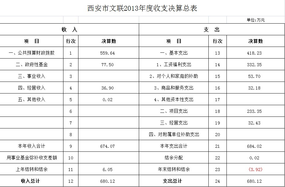 (5)年末结转和结余-3.92万元,主要是本年支出大于收入,收支差额用以前年度结转和结余弥补。