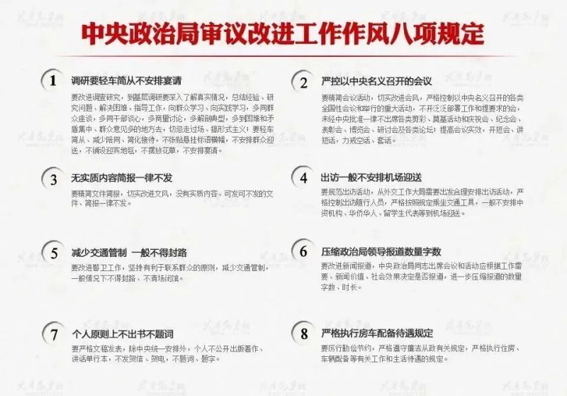 2012年12月4日,中共中央政治局召开会议,审议通过了《中央政治局关于改进工作作风、密切联系群众的八项规定》,因为其主要内容有八条,所以简称“中央八项规定”或“八项规定”。该规定以政治局为表率,以上率下。其主要内容是: